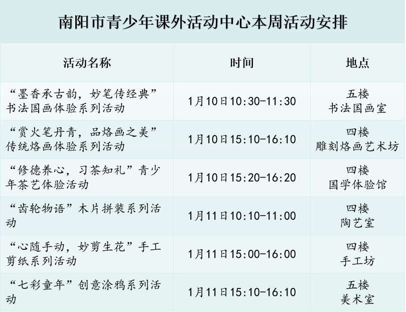 南阳市青少年课外活动中心本周活动安排来啦!欢迎青少年们踊跃参与各项活动,所有活动全程免费。小朋友们,让我们看看有哪些有趣的活动吧!