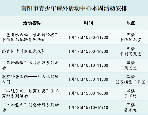 南阳市青少年课外活动中心本周活动安排来啦!欢迎青少年们踊跃参与各项活动,所有活动全程免费。小朋友们,让我们看看有哪些有趣的活动吧!