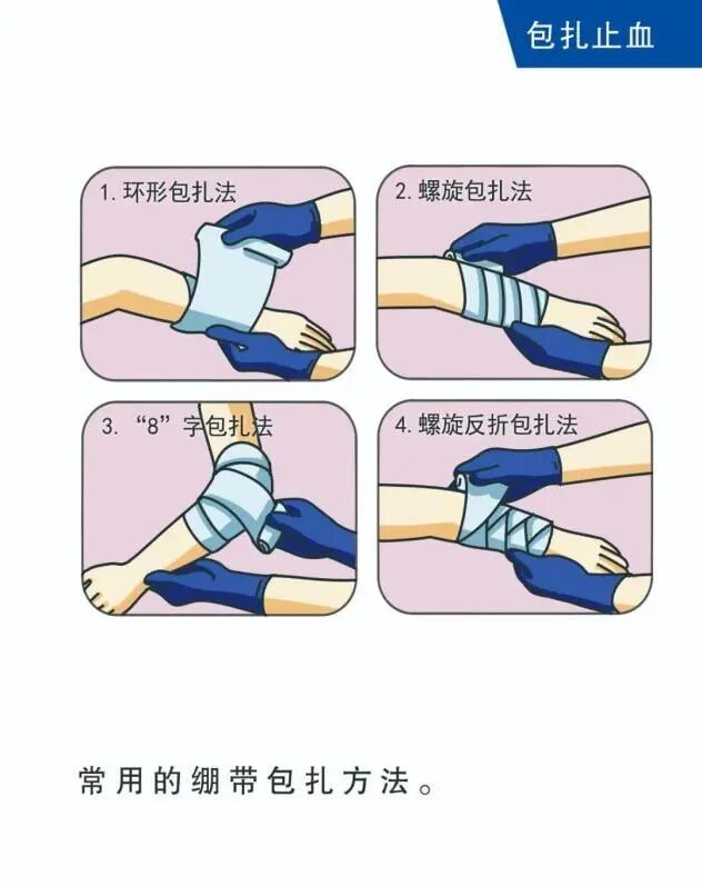 4.绷带包扎:创伤应急处理基础技能,可实现止血、固定伤口的作用,降低感染风险,保护伤者创面。