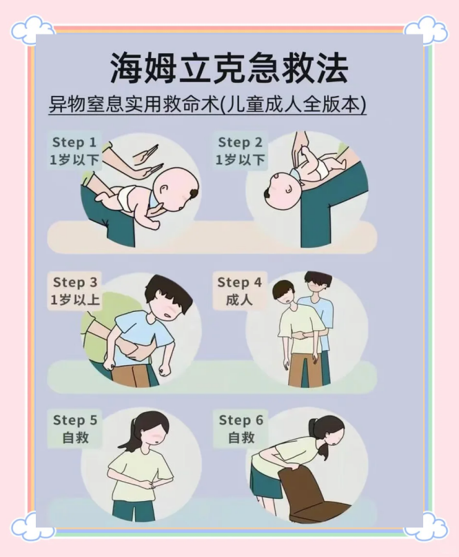 3.海姆立克急救法:应对气道异物梗阻的急救技巧,通过冲击腹部排出异物,适用于成人、儿童等不同人群。