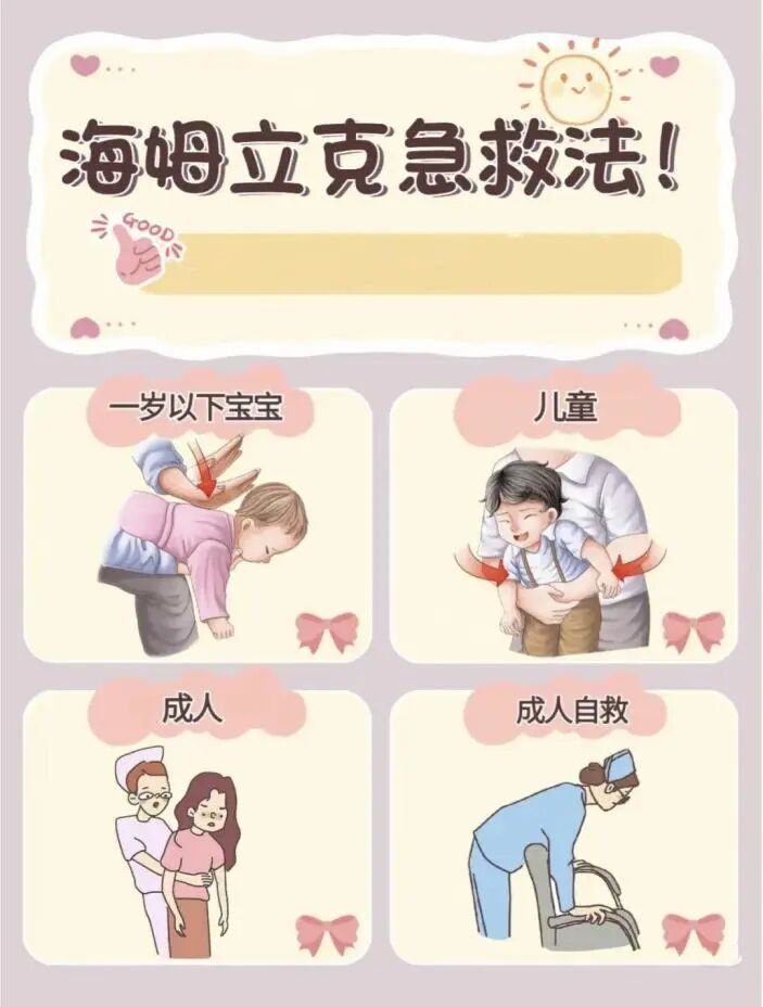 海姆立克急救法:成人、儿童、婴儿气道异物梗阻的不同操作手法。