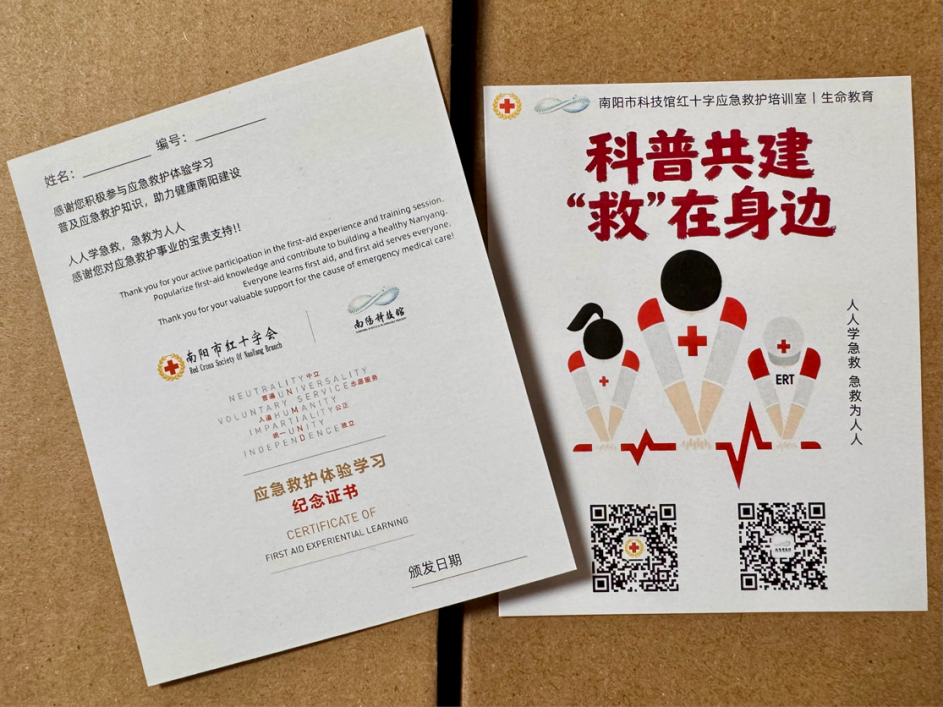 参与并完成全部培训课程的学员,将在课后获得由南阳市科技馆和南阳市红十字会联合颁发的“应急救护体验学习纪念证”(含姓名、唯一编号、颁发日期等信息),不仅是您参与应急救护学习的纪念,也是对您积极学习应急救护技能、助力“健康南阳”建设所付出努力的感谢。