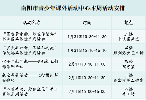 南阳市青少年课外活动中心本周活动安排来啦!欢迎青少年们踊跃参与各项活动,所有活动全程免费。小朋友们,让我们看看有哪些有趣的活动吧!