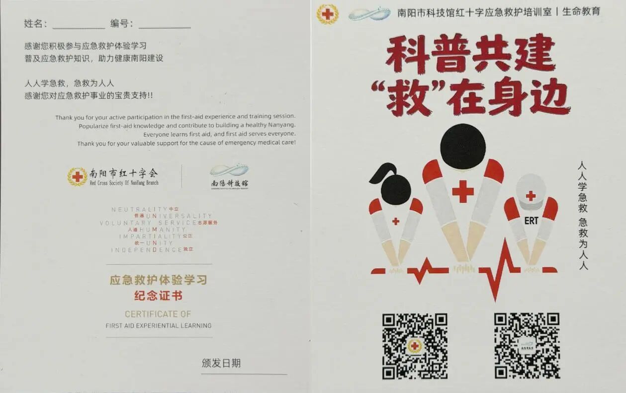 参与并完成本次应急救护课堂全部培训课程的学员,将获得由南阳科技馆与南阳市红十字会联合监制、颁发的应急救护体验学习纪念证书。证书包含学员姓名、编号、颁发日期等信息,兼具学习凭证价值与纪念意义,既是对学员系统掌握应急救护知识与实操技能的认可,也是对学员主动参与公益学习、助力“健康南阳”建设,用专业知识与技能守护自身和他人安全的诚挚感谢。